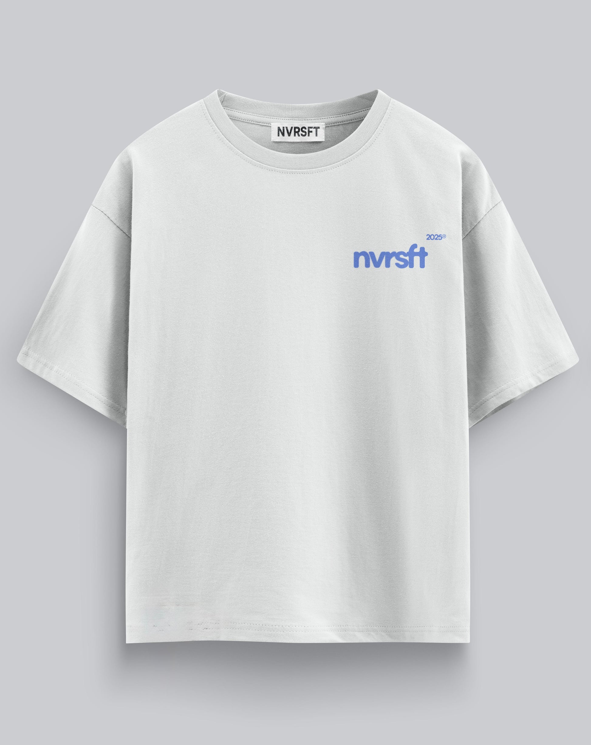Confeccionada en algodón premium con corte oversize, ofrece una textura suave y una caída relajada. En el frente, el clásico logotipo nvrsft® 2025 en azul pastel; en la espalda, un televisor vintage proyecta el mensaje “Crying in 4K”, un statement visual sobre la vulnerabilidad en la era digital.